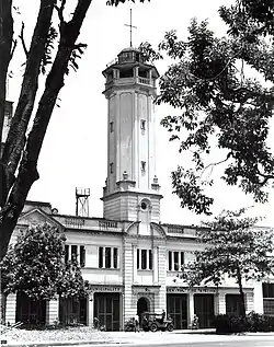 The building was built in 1912, designed by the British firm United Engineers Limited.[2] It was built to house Rangoon's fire brigade, which had been established by the Rangoon Municipal Committee in 1883.[2] The municipality acquired a plot of land on Sule Pagoda Road at a cost of 40,000 rupees.[3] The building, built in the Edwardian style, is noted for its 100 ft (30 metres) octagonal watchtower, and was one of the first iron-frame buildings in Yangon.[2][3]