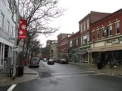 The historic district is roughly divided into three contiguous areas. The commercial heart is located on Main Street, extending eastward from Washington Street to Pleasant Street, and a short way north on Pleasant. The civic core is just to the north, clustered on Dale Street, which runs parallel to and west of Pleasant. Adjacent to the civic core are densely set residences. Running parallel to Main Street to its north is Middle Street, where a number of high quality homes, most built before 1840, are located. At the far western end of Main and Middle Streets are also clusters of densely built residences, extending as far north as Pine Street.[2]