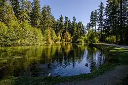 The 5-kilometre (3.1 mi) Terry Fox Trail circles around the upper pond and just reaches the lower pond. Visitors often use this trail for physical activity purposes and it is annually used for the Terry Fox Run for the City of Burnaby.[5] The 2.6-kilometre (1.6 mi) Trail of Hope also circles around the upper pond and reaches the lower pond while a 1.9 kilometer trail circles a portion of the parkland.[6]