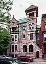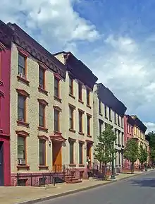 In 1862 Troy suffered another major fire, the worst in its history. A locomotive's spark ignited the wooden Green Island drawbridge that existed at the time, and when that could not be contained to the bridge it spread to the east, ultimately devastating 507 buildings over a 16-block area. As before, the city rebuilt quickly, with the area along Fifth between Broadway and Grant Street, where Cummings built a row of houses between Fifth and Sixth, most strongly reflecting this era of rapid construction and reconstruction. The Gurley Building, too, rose in just eight months from the ashes of its predecessor.[33] The nearby neighborhood also became desirable, with many local businessmen moving into newly built homes along Fifth.[34]