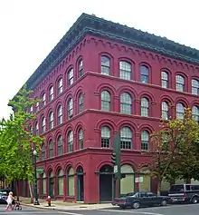 - McCarthy Building: 255 River Street, on the west side of Monument Square. Another 1904 building, noted for large proscenium-style front arch window from original use as furniture showroom.[42] Today it hosts the Troy offices of a regional media company.[53]