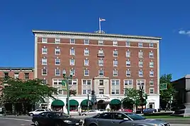 Other architects chose the era's simpler styles, like Arts and Crafts, as a contrast. The marble-and-brick 1905 YMCA building on Second Street, and the six-story Caldwell Apartments at State and Second streets are two of the district's best examples of that style. The latter building, built in 1907, was also the first large-scale apartment building in the city.[47] The Colonial Revival style would also leave its mark in Troy with several buildings. Most notable among them is the Hendrick Hudson Hotel on the east side of Monument Square, a six-story structure that was the largest building ever built in the city at the time.[48] Projects of similar scale, and the city's annexation of the village of Lansingburgh to its north, helped swell its population to over 72,000 in 1930, its alltime peak.