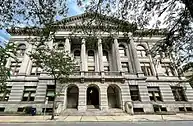 Cummings explored the Richardsonian Romanesque mode in several of his buildings at Russell Sage. The Paine Mansion at 49 Second Street applied the same style, with arcaded entrance loggia and corner tower, to a home. The brick drugstore annex at 155-157 River Street is a particularly representative commercial example of the style.[40] In 1893 the World's Columbian Exposition in Chicago popularized the Classical and Renaissance revivals and Beaux-Arts style. They came to Troy very quickly when Marcus Cummings and his son Frederick designed the Classical Revival county courthouse at 80 Second Street, the third to occupy the site, the following year. A short distance away three years later, the Renaissance Revival Hart Memorial Library was built of Vermont marble, joining the similarly styled 1895 Frear Mansion, also on Second Street.[41]