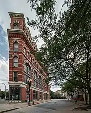 In 1986, it was added to the National Register of Historic Places (NRHP), superseding five smaller historic districts that had been listed on the Register in the early 1970s.[5] (Two years later, in 1988, the extension of the previous River Street Historic District north of Federal Street was added separately to the NRHP as the Northern River Street Historic District.) In late 2014, the State Historic Preservation Board began considering an adjustment to the district's boundaries that would be a net expansion, particularly in its southeast;[6] that increase was made official in 2016.[2] Most of the buildings, structures and objects within the district contribute to its historic character. Two of Troy's four National Historic Landmarks, the Gurley Building and Troy Savings Bank, are located within its boundaries. Nine other buildings are listed on the Register in their own right. Among the architects represented are Alexander Jackson Davis, George B. Post, Calvert Vaux and Frederick Clarke Withers. There are many buildings designed by the regionally significant architect Marcus F. Cummings. The downtown street plan was borrowed from Philadelphia, and one neighborhood, Washington Square, was influenced by London's squares of its era.
