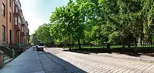 Greek Revival residences were first built in Troy along Second Street in the late 1820s. In 1839, six local businessmen bought a parcel of land between Second and Third at the south end of what was then the developed area of the city and created Washington Park. Modeled on contemporary British residential squares such as those found in London's Bloomsbury neighborhoods,[28] its first phase, on Washington Place, featured rows of townhouses with a unified facade fronting on a park reserved exclusively for residents, whose deeds require a monthly maintenance fee. It retains its integrity despite some later alterations and damage and is one of only two privately owned urban parks in New York.[29][30][31]