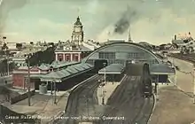 The first building for Central railway station was a structure of wood and corrugated galvanised iron, and opened on 18 August 1889 as the terminus of the line when it was extended from Roma Street railway station.[2] In 1891, the tunnel to Brunswick Street station (now Fortitude Valley) was opened so trains could run directly from Central to northern destinations.[3]