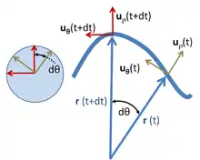 - ↑ Notice that this local coordinate system is not autonomous; for example, its rotation in time is dictated by the trajectory traced by the particle. The radial vector r(t) does not represent the radius of curvature of the path.
