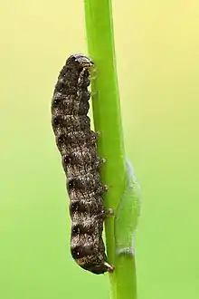Larva reddish brown, with dark bands on dorsal segments; dorsal line slightly paler: subdorsal pale yellow, narrow; spiracular line brownish, yellow in front. The larvae feed on the leaves of various plants, including Luzula, Gymnadenia conopsea, Lotus corniculatus, Veronica chamaedrys, Rhinanthus alectorolophus and Orchidaceae species.[2]