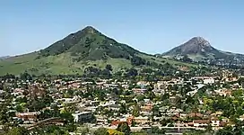 Cerro San Luis Obispo (Obispeño: łpɨłhɨtšnuka [3]) is a 1,292 feet (394 m) mountain in San Luis Obispo, California.[2] It is part of the chain of peaks called the Nine Sisters. It is a common spot for hiking, jogging and mountain biking, and has steep terrain.[4] Below the west side of the visible peak, there is a large plateau with a large wooden stage on the east end. The large white "M" present on the east face derives from Mission College Preparatory Catholic High School.