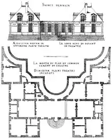 The central building, on the edge of the terrace, was ordered in 1556 by Henry II of France and Catherine de' Medici and was built by Philibert de l'Orme. Called in its day la maison du théâtre (the theater house), a succession of terraces and stairs gave access to the baignerie (from French baigner, "to bathe") on the Seine.