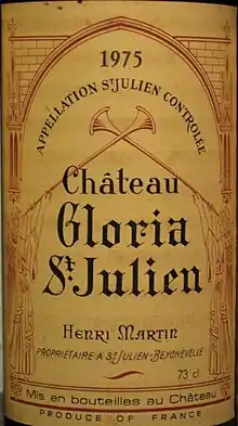 A relatively young estate, Château Gloria was founded and assembled by Monsieur Henri Martin who established the reputation of Gloria within the space of a generation.[3] With the first acquisitions of 6 hectares (15 acres) of vines in 1942, and purchase of the chai of Château Saint-Pierre, Martin added to the estate over the years with land bought from the surrounding classed estates, including châteaux Saint-Pierre, Beychevelle, Léoville-Poyferré, Gruaud-Larose, Léoville-Barton, Ducru-Beaucaillou, Lagrange and a Saint-Julien property of Duhart-Milon, making up its present size.[3][4]