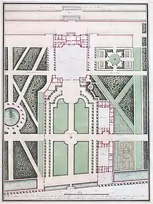 The gardens, designed by André Le Nôtre, extended to the banks of the Seine river. They were also known as the Parc de Bercy.[2] The whole Bercy area around the château and the river were full of gardens and other houses and mansions.[3] These gradually gave way to more condensed housing as the city grew in population during the 19th century.