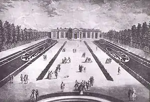 The Château de Choisy was set in an elaborate series of gardens laid out by André Le Nôtre. He was called in before the few existing buildings were swept away and found the site too closed in by dense woodlands: "There one only saw the riverbank as if through a dormer window,"[3] he told the king—who passed on the remark— and advised Mlle de Montpensier to begin in this "vilaine situation" by "laying low all the woods that were there".[4] The view of the river was the main thing, and Mlle de Montpensier calculated it to advantage: "As I had my house built in order to go there in summer, I took measures in order that one might see the river in the time of year when it is at its lowest; from my bed I see it and all the boats that pass."[5]