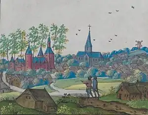 In the twelfth century, the first wooden castle is built, surrounded by a moat. The owners are known as the barons of Lahamaide.[1] They became an important noble family within the county of Hainaut. At the start of the 15th century (before 1415) a stone castle is constructed.