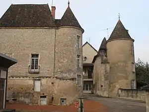 In the Middle Ages, the Château de Lugny, flanked by several towers and equipped with an "extremely high and very beautiful" keep, was surrounded by ditches filled with water from the source of the Bourbonne River - known as the "source des eaux bleues" (blue waters) - which rises at the foot of the castle hill. However, of the imposing castle of the lords of Lugny, burnt down during the French Revolution, there remains today only two round three-storey towers, traditionally dated from the 14th century, and part of the common buildings corresponding essentially to those of the old lower courtyard of the manorial residence and forming a quadrilateral.
