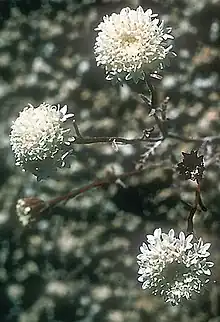 The Mojave pincushion flowers are produced in a capitulum 3–6 cm diameter, and are white.[5]
