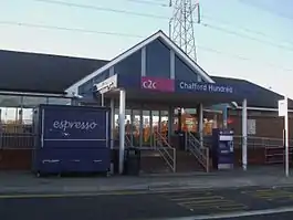 Chafford Hundred railway station,[4][5] also known as Chafford Hundred Lakeside station, is located on a single-track branch line of the London, Tilbury and Southend line, serving the area of Chafford Hundred as well as Lakeside Shopping Centre in Essex. It is 20 miles 77 chains (33.7 km) down the line from London Fenchurch Street via Upminster; it is situated between Ockendon and Grays. Its three-letter station code is CFH.