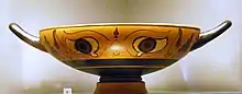Chalcidianising cups were probably produced in the important workshop of the potter Nikosthenes and his successor Pamphaios, as can be deduced from at least two signed specimens made in that workshop. This cup type has a low but heavy foot with a concave edge. It is apparently influenced by a cup type invented by the producers of Chalkidian pottery in Southern Italy. Chalcidianising cups are one of several examples of Attic potters adopting South Italian vase shapes, so as to be able to accommodate South Italian tastes and retain Attic dominance over that market. Their decoration also follows South Italian tastes, including the addition of noses between the eyes, and of (satyr) ears on the rim. Except a single example that may have been discovered in Athens, all known Chalcidianising cups have been found in Southern Italy. They were produced around 530 BC.