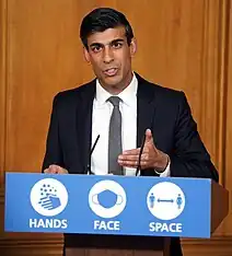 On 17 March 2020, Sunak introduced a programme providing £330 billion in emergency support for businesses,[23] as well as a furlough scheme for employees. This was the first time a British government had created such an employee retention scheme.[24][25] The scheme was introduced on 20 March 2020 as providing grants to employers to pay 80% of a staff wage and employment costs each month, up to a total of £2,500 per person per month.[25] The cost has been estimated at £14 billion a month to run.[26] The Coronavirus Job Retention Scheme initially ran for three months and was backdated to 1 March. Following a three-week extension of the countrywide lockdown the scheme was extended by Sunak until the end of June 2020.[27][28] At the end of May, Sunak extended the scheme until the end of October 2020. The decision to extend the job retention scheme was made to avoid or defer mass redundancies, company bankruptcies and potential unemployment levels not seen since the 1930s.[29] After a second lockdown in England on 31 October 2020, the programme was further extended until 2 December 2020,[30] this was followed on 5 November 2020 by a lengthy extension until 31 March 2021.[31] On 17 December 2020, the programme was further extended until 30 April 2021.[32] In the 2021 budget held on 3 March 2021, Sunak confirmed that the scheme had been extended once more until 30 September 2021.[33]