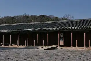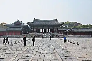 Myeongjeongjeon is the palace's main hall, where state affairs such as meetings with officials and royal banquets were held.[3] First built in 1484, it was burned down during the Japanese invasion of 1592. Rebuilt in 1616, it is the oldest main hall of all the palaces in Seoul.[3] It is smaller than the two-story main halls of Gyeongbokgung and Changdeokgung because it was originally built as the queen's living quarters, rather than as a throne hall.[3] Although it is a simple, one-story structure, Myeongjeongjeon was built on an elevated stone yard that imbued it with the dignity of the main hall. Running through the courtyard in front is a three-level walkway whose centre path was for the king's use only.[3] Surrounding the entire area is a wall-like structure of single-room units which were used by the royal guards or for royal funerals. Myeongjeongjeon is designated as National Treasure 226.