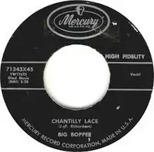 "Chantilly Lace" is a 1958 rock and roll song by The Big Bopper. It was produced by Jerry Kennedy, and reached No. 6 on the US Billboard Hot 100. Bruce Channel covered the song on his 1962 album, Hey! Baby.[1] The song was also covered by Jerry Lee Lewis in 1972.