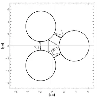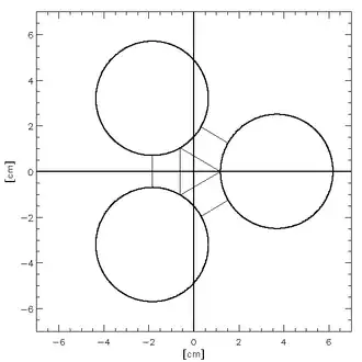 An excellent example system is the "Gaspard–Rice" (GR) scattering system [1] —also known simply as the "three-disc" system—which embodies many of the important concepts in chaotic scattering while being simple and easy to understand and simulate. The concept is very simple: we have three hard discs arranged in some triangular formation, a point particle is sent in and undergoes perfect, elastic collisions until it exits towards infinity. In this discussion, we will only consider GR systems having equally sized discs, equally spaced around the points of an equilateral triangle.
