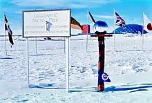 On December 14, 1956, Bevilacqua and his team erected a 15-foot (4.6 m) pole that remained in use as the "ceremonial South Pole" at least until 2018.[16] The ceremonial pole was supposed to be painted with a red-and-white candy stripe, but Bevilacqua instead painted it orange and black, the colors of his Woburn high school football team. When questioned, he claimed that all other colors of paint had been frozen.[4][3] The pole remained orange and black until 1980, when it was repainted to red and white.[17] Bevilacqua also put up a sign nearby, "City Limits of Woburn", took pictures, and sent them to the local home newspaper.[11]