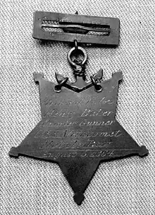 Born in 1809 in the Georgetown area of Washington, D.C., Baker was living in New York City when he joined the Navy. He served during the Civil War as a quarter gunner on the USS Metacomet. At the Battle of Mobile Bay on August 5, 1864, he was among the crew of a small boat sent from Metacomet to rescue survivors of the USS Tecumseh, which had been sunk by a naval mine (then known as "torpedoes"). Despite intense fire, the boat crew was able to pull ten Tecumseh men from the water. For this action, Baker was awarded the Medal of Honor a year and a half later, on January 15, 1866.[1][2] Baker's first name is given in some records as "Henry", and his medal is inscribed with that name.[3] Five other members of the boat crew also received the Medal of Honor: Seaman James Avery, Ordinary Seaman John C. Donnelly, Captain of the Forecastle John Harris, Seaman Henry Johnson, and Landsman Daniel Noble.[2][4]