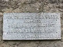 In 1995, a harp-shaped plaque was erected outside of Bunworth's former home in Buttevant and unveiled by Robert Warke, Bishop of Cork, Cloyne and Ross. An accompanying inscription reads: "Rev. Charles Bunworth, 1704 - 1772, Celebrated Harpist, Rector of Buttevant, Buried in St. John's Churchyard". Bunworth and his music were commemorated in a festival of local music held in Buttevant.[15]