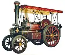 The first road locomotives started to emerge from the St Nicholas works in the late 1870s, with 14 engines specifically designed for the job of road haulage produced between 1878 and 1890.[17] Following the changes to the law made by the Locomotives on Highways Act 1896 the market for road locomotives expanded considerably. Charles Burrell & Sons Road Locomotives were slightly modified versions of their general-purpose engines to allow for faster rates of travel over long journeys.[18] A general-purpose engine was designed to spend much of its life stationary, powering belt-driven equipment, whereas a road locomotive was constantly on the move, therefore subtle design differences were needed. These modifications included stronger drive shafts, gears and wheels; additional water-carrying capacity; generally a canopy was fitted; solid flywheels and additional platework around the engine's cylinder motion.[19]