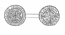 - ↑ Griffiths, George Edward (1752). "Art. VIII. Some Conjectures Relative to a very ancient Piece of Money, lately found at Eltham in Kent, &c. By Charles Clarke". The Monthly Review. 6: 69–70.