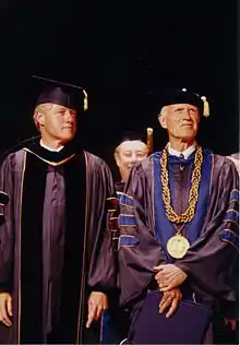 Young was a fellow of the American Academy of Arts & Sciences from 1994.[56] He received the UCLA Medal in 1998.[57] The first alumnus ever to lead UCLA, Young received the Edward A. Dickson Alumnus of the Year Award from the UCLA Alumni Association in 1994.[58] He received the Distinguished Alumnus Award from the UC Riverside Alumni Association in 1986.[59] In 1997, UCLA's University Research Library was renamed in his honor.[60]