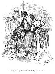 Worth began sewing dresses to complement the shawls at Gagelin. Initially, these were simple designs, but his expert tailoring caught the eye of the store's clients. Eventually, Gagelin granted Worth permission to open a dress department, his first official entrance into the dressmaking world.[8][9][10] A 1958 article in The Times published shortly before a centenary exhibition in London to mark the opening of his Paris fashion house noted that the ambitious Englishman's ideas were almost too much for his employers: "The young Worth, full of ideas, was having such a success at Gagelin's that it was felt necessary to restrain his rashness".[9] His obituary, written by a Paris correspondent for The Times explained this comment in somewhat more detail, saying that he was refused a share in the Gagelin business, even though he had extended its activities into making up, rather than just selling, garments.[11] He had also helped build the company's international reputation by exhibiting prize-winning designs to both The Great Exhibition of 1851 in London and the Exposition Universelle in Paris four years later.[6] At the Paris exposition he had displayed a white silk court train embroidered in gold.[1]