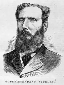 He was born in Scotland, and joined the Victorian police as a cadet officer in 1852 with several others who afterwards attained high rank in the force.[2] Amongst them were the chief commissioner, Chomley, J. Lyddiard, Sadleir, Reginald Greene, Winch, William Templeton, Leopold Kabat, and others.[2] From the first he showed great zeal and enthusiasm for duty, and one of his earliest exploits was in an encounter with bushrangers when stationed at Kilmore.[2] A gang of Tasmanian escapees had crossed the Straits, and taken to the roads in Victoria, their favourite haunts being the old Sydney-road and the track between Kilmore and McIvor.[2] In company with H. Thompson, another cadet, and a couple of troopers, Nicolson went in pursuit, and halted one day for lunch at a roadside hotel.[2] They left Thompson in charge of the horses at the stable, and while they were at lunch the bushrangers, not suspecting the presence of the police, rode up.[2] Seeing Thompson in uniform, they at once fired, shooting him through the chest and lungs, and galloped off.[2] The others rushed to their horses, started in pursuit, and, coming up with the outlaws, exchanged shots, Nicolson and Sergeant-Major Nolan being the first to get to close quarters.[2] They each picked their man, and, being armed only with the old type of horse-pistol, there was not much shooting.[2] Nicolson, without firing at all, rushed his man, seized him by the back of the neck, dragged him from the saddle, and so captured him.[2]