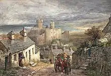 Charles James Adams - Harlech Castle with horse and cart on a blustery day. Watercolour.