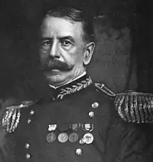 In January 1899, Hodges was recommended for promotion to major by brevet to recognize his heroism in Cuba.[15] During 1899, Hodges performed temporary duty as commander of the army recruiting offices in Seattle and Portland,[16] then commanded the post at Fort Sam Houston, Texas.[17] In July 1900, he was promoted to major.[17] In November 1900, he was assigned to the 17th Infantry Regiment for duty in the Philippines during the Philippine–American War.[18] In August 1901, he transferred from the 17th Infantry to the 23rd Infantry.[19] Hodges continued to serve with the 23rd Infantry after returning to the United States, and he was promoted to lieutenant colonel in August 1903.[1][20] In 1906, Hodges was assigned to command the post at Fort Ontario, New York.[21] In January 1907, he received promotion to colonel.[22]