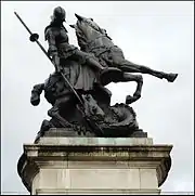 - St Mary-le-bone War Memorial, Lord's Roundabout, St John's Wood, City of Westminster, London NW8: an equestrian St George in the act of dragon-slaying with two relief panels on the stone plinth showing 'Peace' and 'Justice'. Hartwell took on the commission in 1923 after Alfred Drury had withdrawn. Another version at Eldon Square, Newcastle upon Tyne.[2]