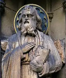 [Indoors] "the braces to the chancel roof are supported on winged angels holding shields, which are charged with the emblems of the Passion ... [Outside on the tower], facing the high road, is the principal entrance door, with the well-known four-leaved flowers carved in the hollow of the jambs and arch, the hood mould is finished with the heads of king and bishop; over the doorway is a canopied niche in which is placed the figure of St. Matthew ... Mr. Charles Mawer has executed the carving in a most creditable manner."[48] (Yorkshire Post and Leeds Intelligencer 22 September 1875)
