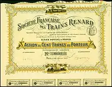 Bearer share certificate. Société Francaise des Trains Renard SA, issued 29 January 1907