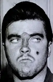 Schmid was a short man who wore cowboy boots stuffed with newspapers and flattened cans to make him appear taller; he explained to impressionable teenagers his resultant rolling gait was a result of a "crippling fight" with Mafia members. He used lip balm, pancake makeup and created an artificial mole on his cheek.[9] Schmid also stretched his lower lip with a clothespin to make it resemble Elvis Presley's.[10]