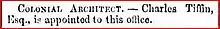 In December 1859, Tiffin became Colonial Architect for the colony of Queensland, Australia.[5]