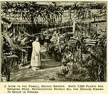 "I can remember my first orchid, I was just looking over the country one Sunday, about 18 months after I got down there when I saw it way up near the top of a tall tree. 'You're certainly a beauty,' I said. 'I must have you.' While I was standing there wondering how on earth to climb that tree a bare-footed Indian came along. 'I'll give you 25 cents gold to get that flower,' I said. The Indian used the vines to swing to the tree [like Tarzan] and cut off the orchid."[21] "For about five years, I suppose, I would pull the orchids apart and study them, but never keep the plants."[21] "He studied the orchid intelligently: learning, throughout the years about orchids from books, worldwide correspondence, and visitors."[27] About the books he remarked: "I couldn't read a French or German newspaper, but with a little Latin I could make out the technical works."[21] In February 1916, Powell was pondering his many memorable orchid-related experiences: echoing in his mind, no doubt, were those at Gatun Lake. A watershed moment occurred; "he lost no time starting an orchid garden."[27][28] "Powell started his collection on his front porch. When that got so packed with plants he couldn't move, he started an annex by building a tier of shelves on the rear wall of his house."[21] "It wasn't long until both were overflowing and he had to construct a latticed roof and screened-in, vine-clad, wire mesh walls."[21] "The establishing of the garden was actuated by the act of Mrs. A. H. Bryan presenting Mr. Powell with about a thousand plants, and a further donation by Charles H. Beetham."[10] There was nothing published on growing orchids outdoors; Powell pioneered the techniques.