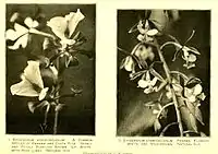 Transitioning from hobbyist to horticulturist, Powell needed a way to forward his finds to researchers and preserve them for future reference. He studied the standardized method for specimen preservation and storage. Specimens were dried by extracting moisture in a device called a plant press; however in one instance he noted: "Live flower mashed flat with finger."[44] Although he was initially cautioned against it, he added artificial heat (an electric light bulb or electric iron) which aided in the quality of the results in the tropics.[37][39][45] In a letter to Rolfe, Powell asks: "It [the drying] was done over an Electric Light Bulb while lighted up. I have done a lot of experimenting in the drying of flowers, both with stove and sun heat, but this seems to have been the most successful. How is it for a Specimen?"[46] The pressed plant could then be affixed to a mounting sheet (11 X 17 inch paper). Label data (essential documentary information) was added. Once label data was added to the mounting sheet, it was ready for shipping. The mounting sheet (specimen) became a candidate for long-term storage in a repository (like the Harvard University Herbaria). Once accepted, the mounting sheet would then be known as a herbarium specimen. At first he sent just the preserved flowers, but soon he was asked to send preserved plants that included the roots, stems, leaves, flowers, and seeds. Powell painstakingly crafted his mounting sheets; he enhanced them with fieldnotes, illustrations, flower cutouts, and photographs. His original sheets would stand on their own as works of art; over time they have evolved into beautiful, remarkably detailed documents.