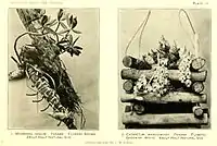 George Harry Pring (see below) elaborated on collecting bucket orchids: "Removing a clump of these plants may be compared with disturbing a hornet's nest, but, according to Mr. Powell, who had experienced both adventures, the hornets are easier to combat than the thousands of small stinging ants."[39] Pring then told of a fourth collection technique used by Powell and Hunter; one Pring himself used. "In many instances, to dislodge the epiphyte [an "air plant", growing non-parasitically, sometimes 40–50 feet from the ground] without climbing the tree, it is necessary to cut a sapling with a forked-top as long as the distance up to where it clings. Its roots in some cases are three to four feet long, and great dexterity is required to dislodge it as to not cause injury. During this operation, clouds of dust, granulated bark and moss which rain down from above almost blind the collector."[40] "These men got many fine specimens through this method."[27]