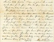 Darling little Lesslie [as called in childhood; as spelled by father] I am so glad he is well and cries for his pa. Bless his pure little heart. 'Hush my baby don't you cry Your papa will come by ner bye.' I would walk a mile to see him this minute. Mrs Anderson + Letitia Rowe were in the store yesterday. They send a heap of love to you + Lesslie. [...] Affectionately Ben K. Pullen