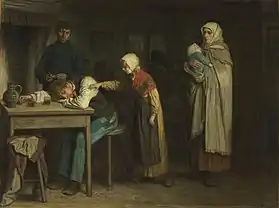 Around 1853 de Groux had his first success with his work The Drunk (Royal Museums of Fine Arts of Belgium) (another version referred to as The farewell on the art market in 2017). It depicts a woman who is lying sick and dying on her bed while her drunk husband holding a bottle is brought in by two young children. The sober palette and the execution that neglected detailed depiction for global effect as well as the subject matter were de Groux' radical break with the Classicist style of Navez in favor of the 17th century genre painters such as Adriaen Brouwer. During this period de Groux painted many compositions depicting the disadvantaged people of his day in their misery and vices such as alcoholism and lassitude. Often he depicted scenes with priests and pilgrimages. He still painted some history scenes in this later phase such as The death of emperor Charles V (Royal Museums of Fine Arts of Belgium) and Frans Junius preaching the Reformation in secret in Antwerp.[6]