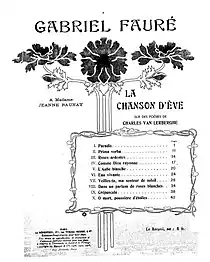During the first half of the 20th century, other composers set song cycles from Van Lerberghe's two collections. Six from Chanson d’Éve were chosen by Paul Lacombe (Op.132, 1907);[32] eleven by Robert Herberigs in 1922;[33] and fifteen in 1925 by Alfred La Liberté (1882-1952).[34] René Bernier set four poems from Entrevisions, also in 1925,[35] while fr:Louis de Serres borrowed Fauré's title for his Le Jardin Clos, suite de 5 poèmes pour voix de femme (Op. 6 ).[36] Some single settings from Entrevisions have also been notable, particularly the Berceuse of Alphons Diepenbrock ("Le Seigneur a dit à son enfant" (1912),[37][38] and Barque d'Or ("Dans une barque d'Orient"), set in the 1920s by Aldo Finzi,[39][40] Eva Ruth Spalding also composed a single setting of van Lerberghe's "Vers le Soleil" in 1923.[41]