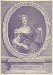 In modern historiography, there are two portraits of Desmares regarded as authentic.[21] One of them is a pastel by Charles-Antoine Coypel, dated to the 1720s, and published in 1733 as an etching by François-Bernard Lépicié; the pastel was mentioned in Desmares' inventory of 1746.[22] In Coypel's pastel, now presumed lost, Desmares is shown holding a mask and a dagger, indicating her abilities in comedy and tragedy, stressed in the quatrain on Lépicié's print.[23] An oil on canvas copy of the pastel, once attributed to Coypel and owned by the painter Pierre-Nolasque Bergeret, was acquired from the latter in 1827 by the Comédie-Française, where it remains.[24][25] Another authentic portrait of Desmares, painted by Jacques Aved, was listed in Desmares' inventory of 1753; it then passed to her daughter Charlotte d'Amour, remaining until the latter's death in 1783.[26]