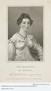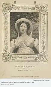 In 1807 she was working in Portsmouth as a dress-maker for a Miss Warren. In 1808 she moved to Gosport where she worked as a housemaid[3] and it was at this time the Portsmouth Company of actors made their annual visit to her home city. An actor named Mardyn "of low habits" was among its members; he played the "second-rate lover's parts" and also sang. Among his popular numbers was 'Darby Kelly, O!', which was "sung by Mr. Mardyn at all the theatres and public places of amusement in London, with general applause."[5] He met the attractive 16 year-old Charlotte Mardyn; she being ambitious for a better life and wishing to escape the drudgery of the kitchen the two quickly married and she joined the Portsmouth Company. In 1808 at the theatre in Portsmouth she made her first appearance, opposite her husband in the farce The Jew and the Doctor. Being illiterate her parts had to be taught to her. Lacking in experience and confidence she experienced stage fright at first and was not a success. She played walk-on roles and appeared in crowd scenes and did a little dancing. At this time a critic wrote of her that: "Her beauty of face, and symmetry of form were well adapted for it; but alas! when she had to open her mouth, all the illusion was destroyed." While her husband turned more to drink Charlotte Mardyn set about improving her education and her grammar and pronunciation and she separated from her husband. By 1810 she had at least one child.[3]