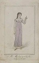 Mardyn made her début at the Theatre Royal, Drury Lane in 1816 as Amelia Wildenhaim in Lovers' Vows and in which she made a great success. Next she was Albina Mandeville in Reynold's The Will before going on to play Miss Peggy in Garrick's The Country Girl and Miss Hoyden in A Trip to Scarborough. At this time her estranged husband reappeared on the scene demanding her salary so she refused to go on stage. Eventually she agreed to pay him £2 a week to be rid of him and on the condition that he did not come within 100 miles of her. However, her husband's brother later sent her a letter stating that her husband had died and requesting money to cover the funeral costs. Having sent the money a week later she found her supposedly dead husband drunkenly staggering towards her home with the intention of causing trouble. Mardyn went on to appear in Tamerlane, The Quaker, Revenge and Twenty Per Cent (1815). She was Zuleika opposite Edmund Kean in The Bride of Abydos (1818)[7] adapted from Byron's poem of the same name and played Sylvia in Farquhar's The Recruiting Officer (1819).[6]